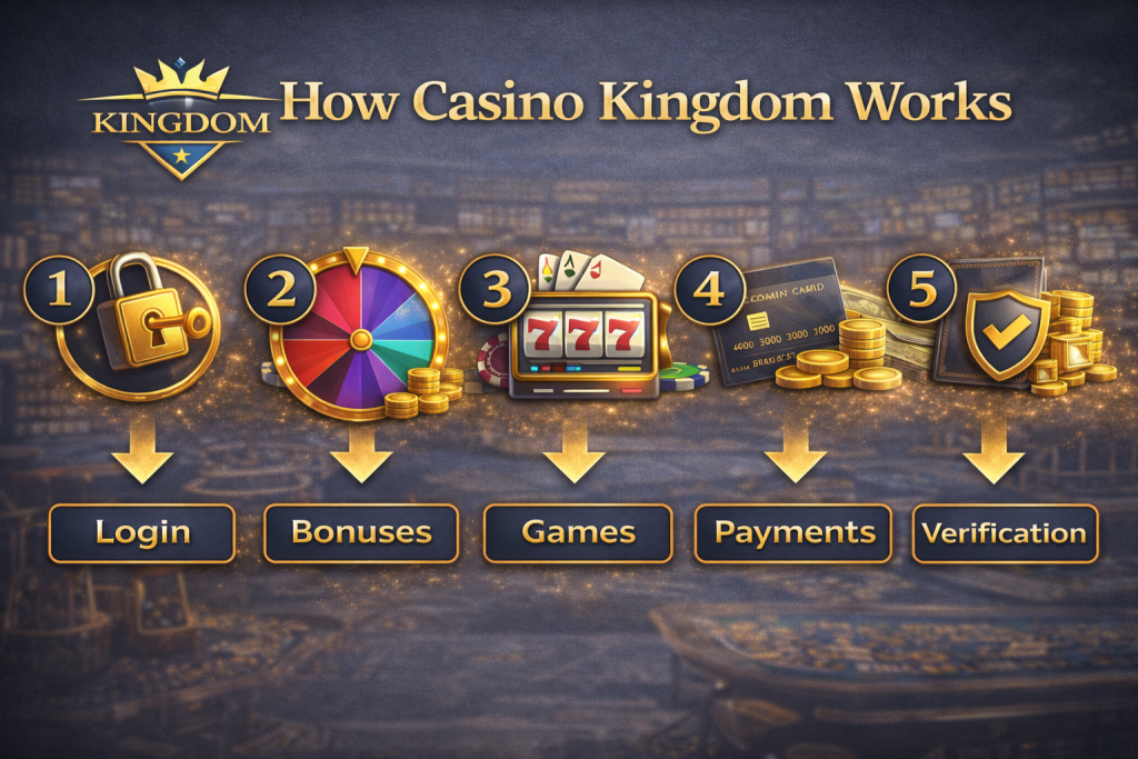 The infographic above illustrates how Casino Kingdom structures the player journey — from login and bonus access to gameplay, payments, and verification.
